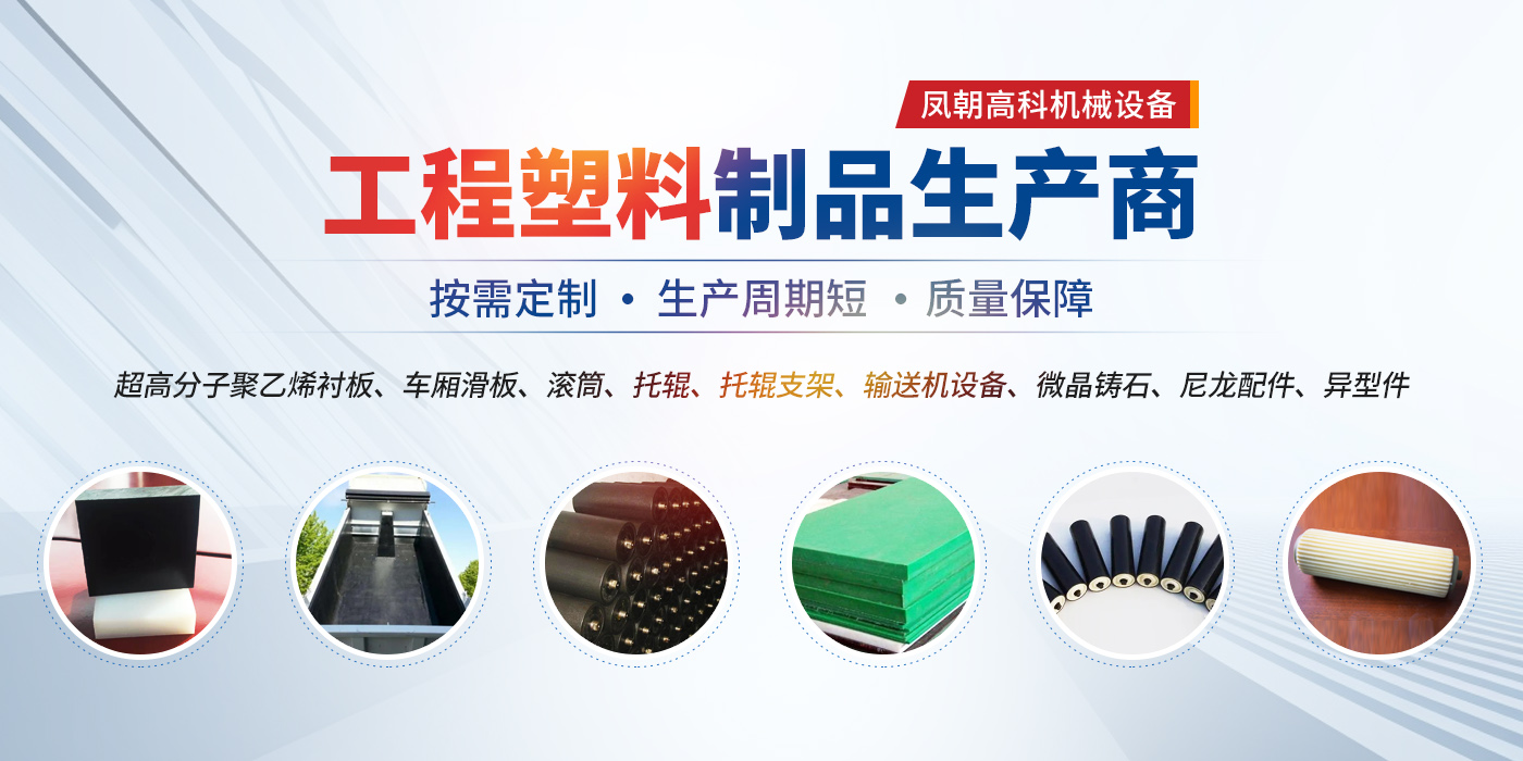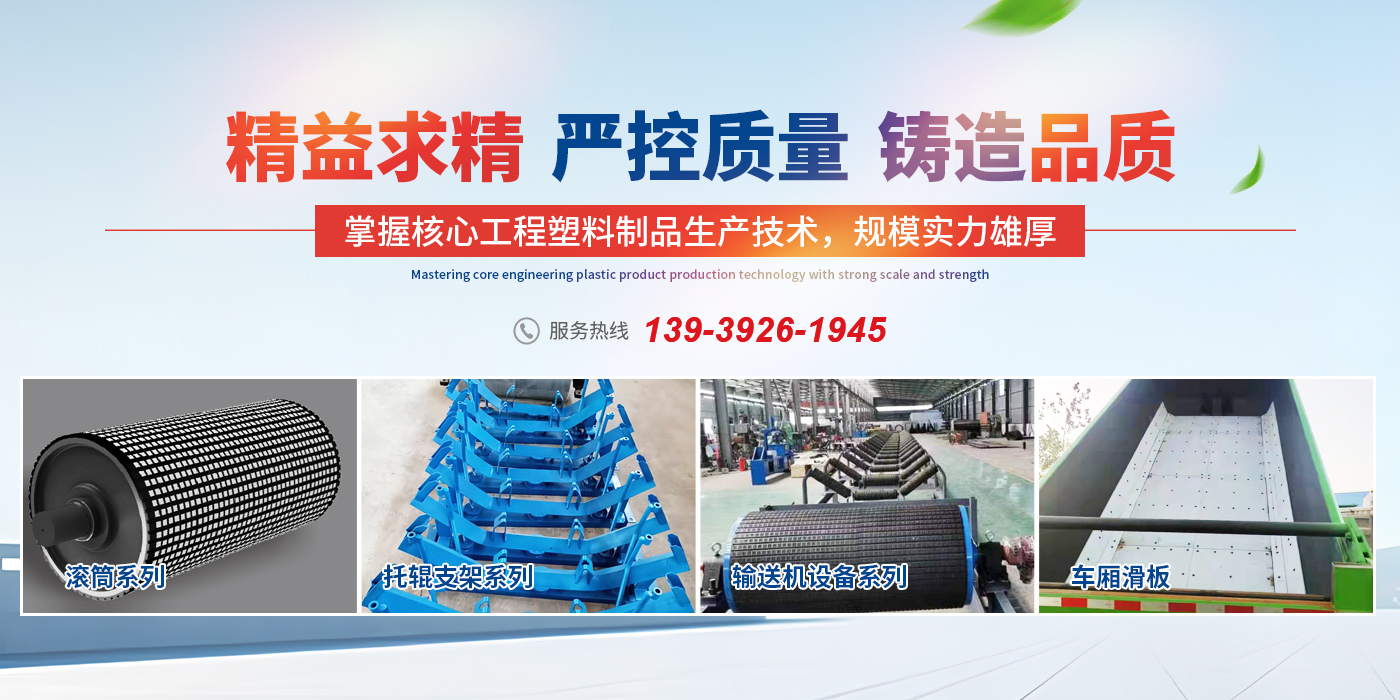 主營生產輸送機、襯板、托輥、支架、耐磨陶瓷、滾筒及其它系列工程塑料產品